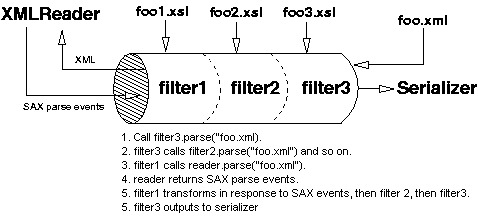 Transformer2, and so on -- whereas in the UseXMLFilters sample, Transformer3 "pulls" its input from Transformer2,